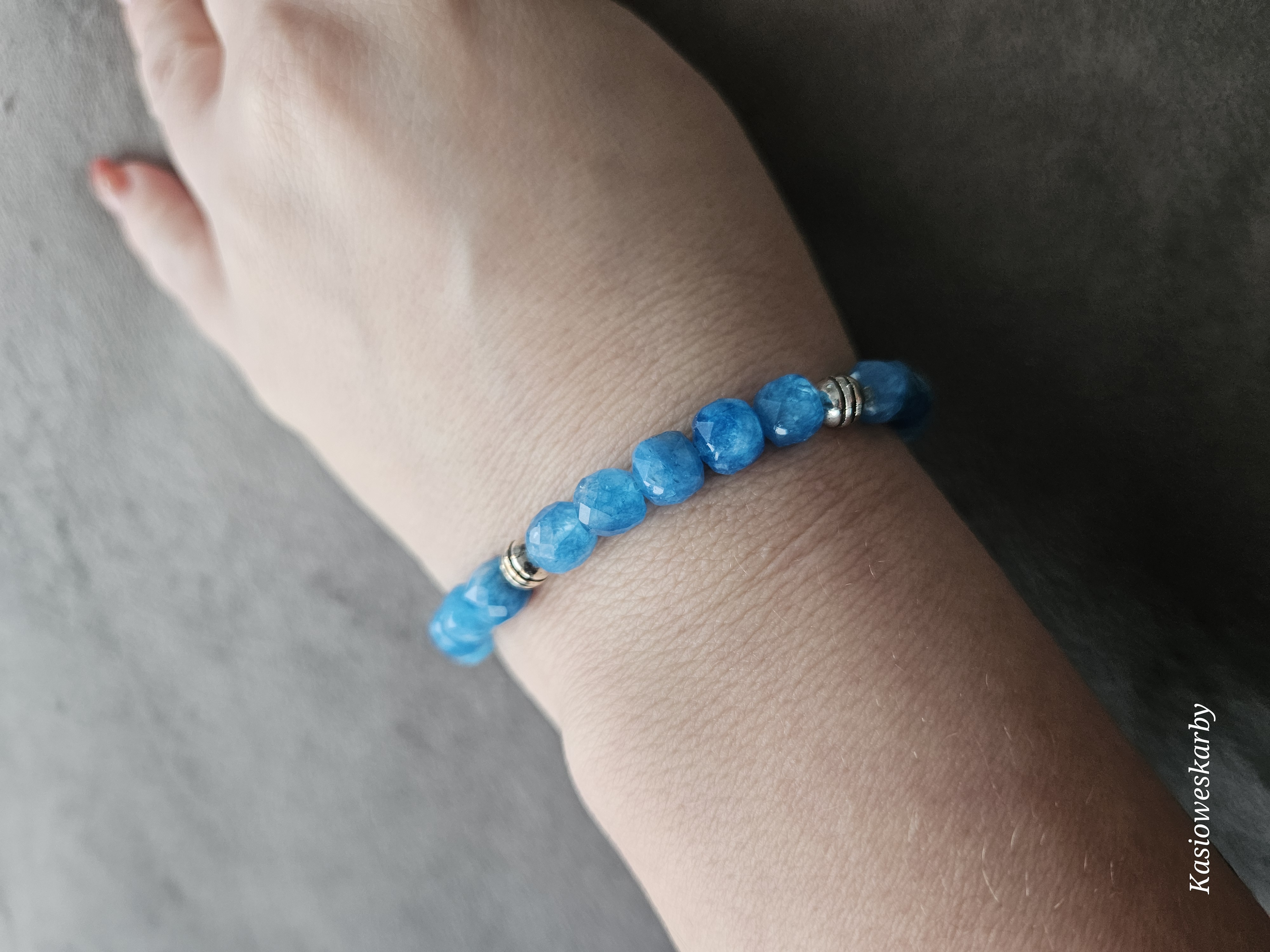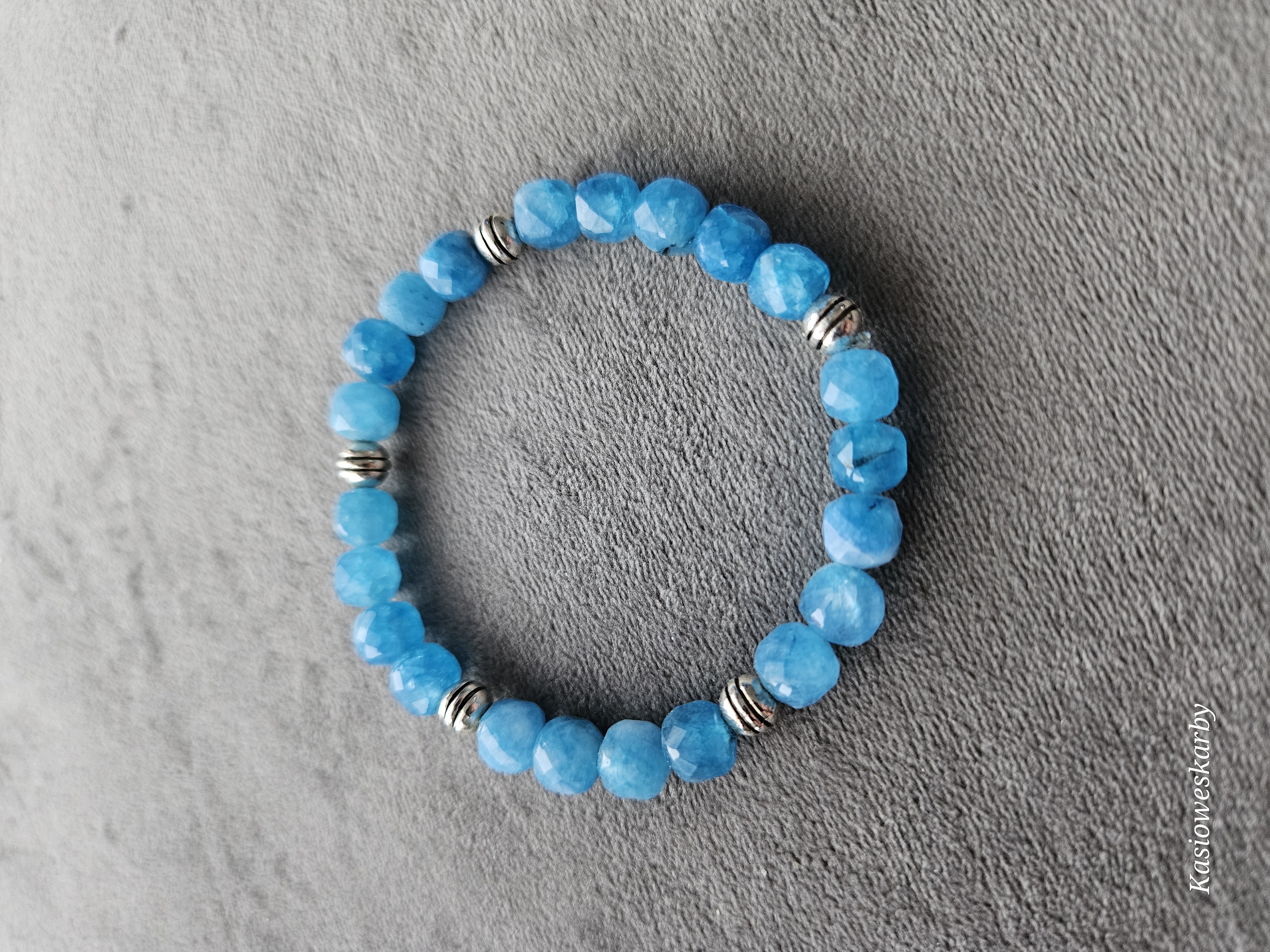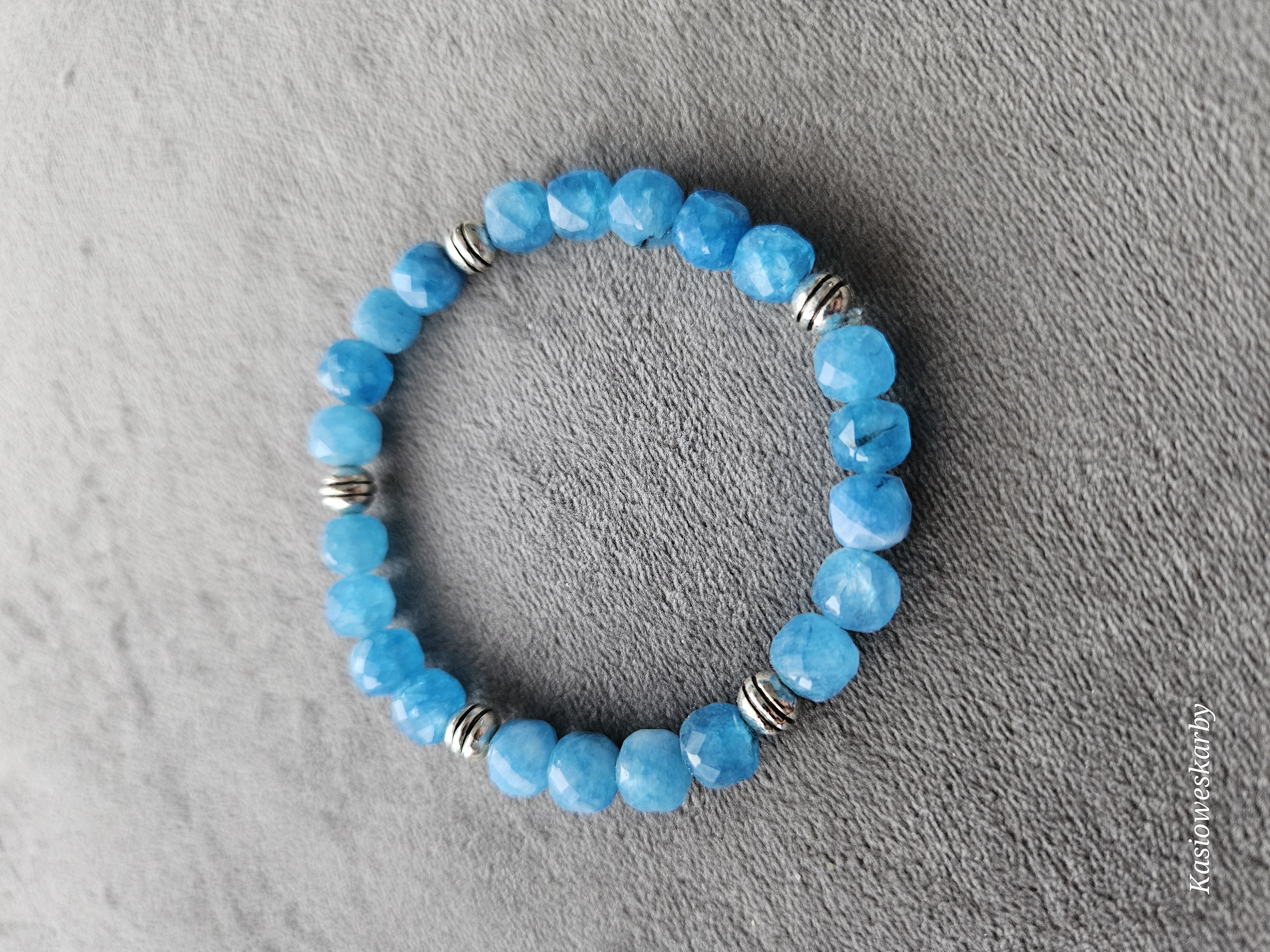 Bransoletka na gumce wykonana z  kamieni chalcedonu i elementów
