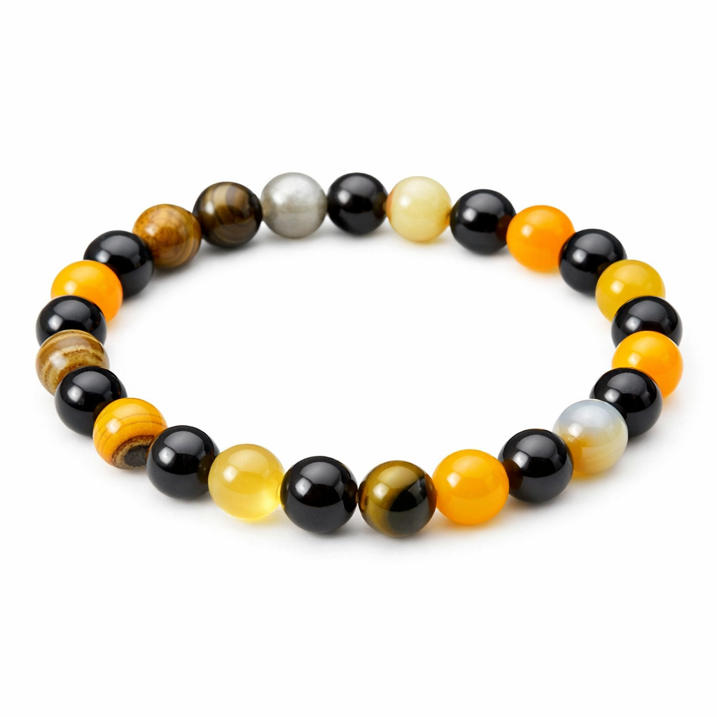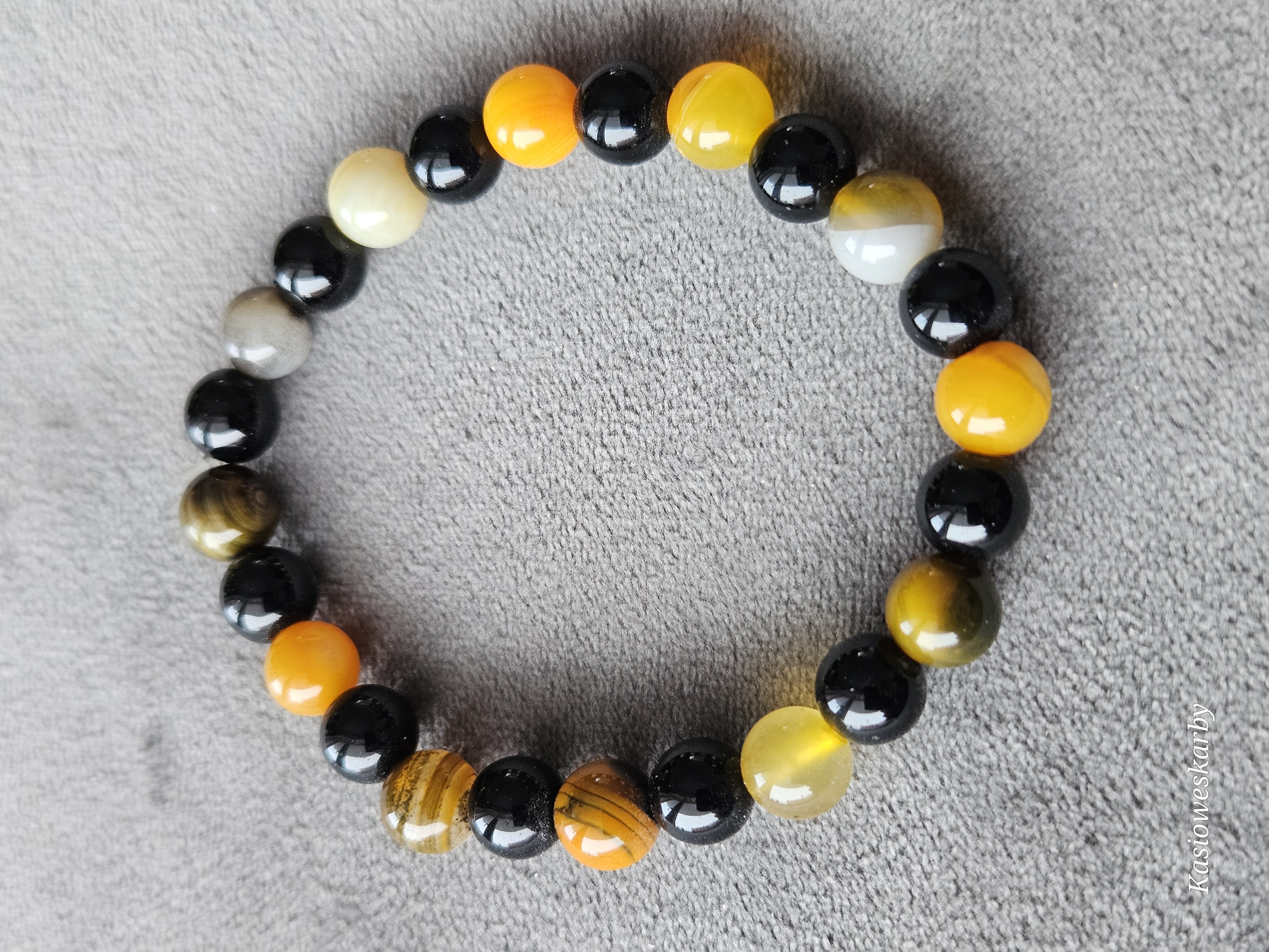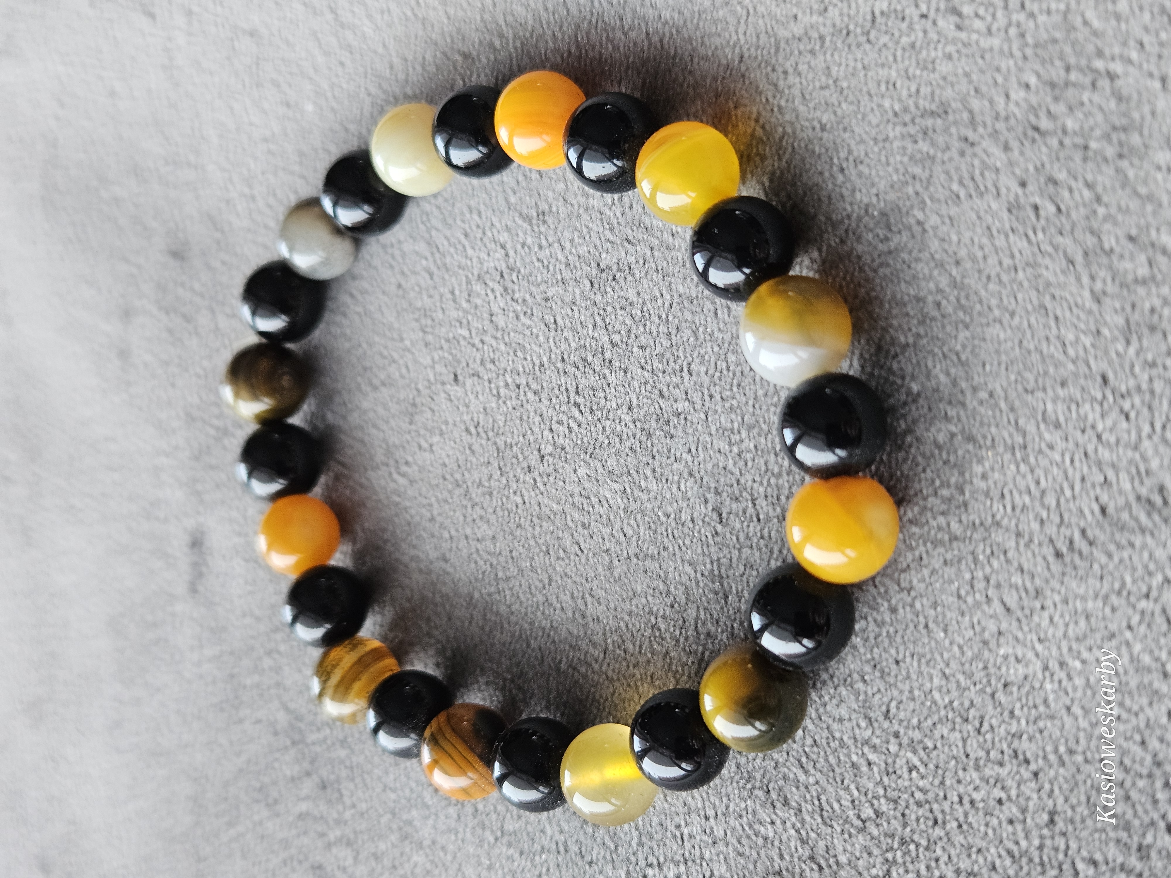 Stylowa, ręcznie wykonana bransoletka z naturalnych kamieni w kontrastowym połączeniu czerni, żółci i ciepłych miodowych odcieni. Gładko polerowane kulki pięknie odbijają światło, tworząc elegancki, a jednocześnie wyrazisty dodatek.