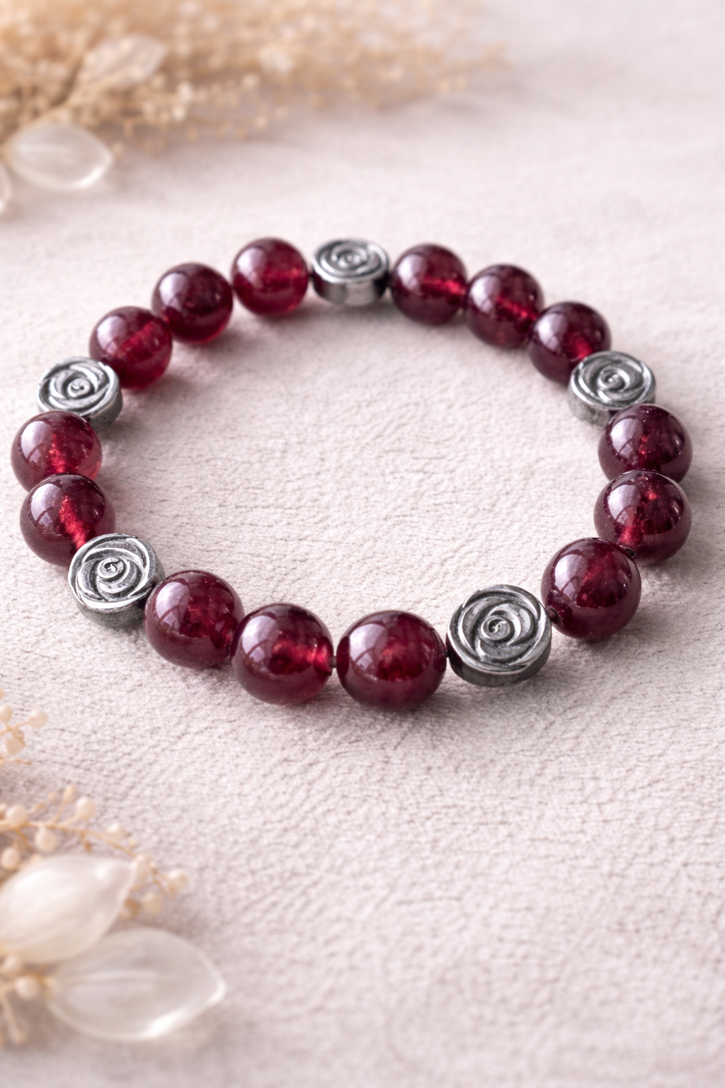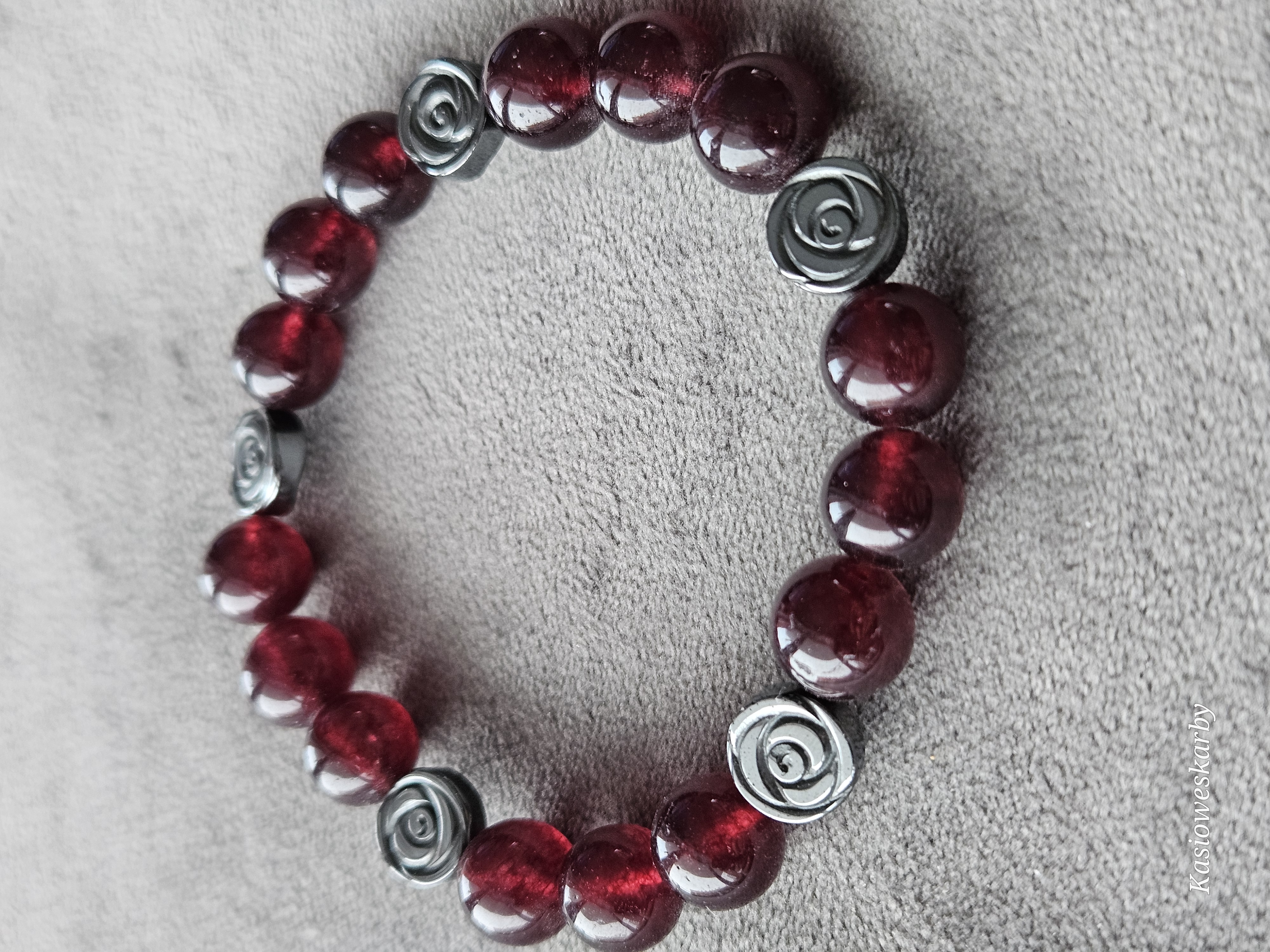 Wyjątkowa bransoletka wykonana z połyskujących, czerwonych kamieni o głębokim, winno-bordowym odcieniu. Całość dopełniają ozdobne przekładki w kształcie róż w kolorze srebra, które nadają biżuterii elegancji i romantycznego charakteru.