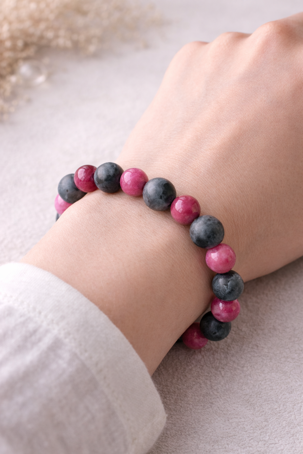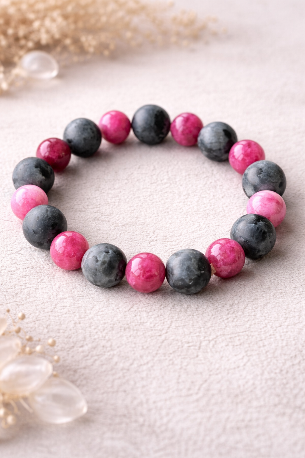 Elegancka i kobieca bransoletka wykonana z naturalnych kamieni w odcieniach intensywnego różu oraz głębokiego grafitu. Połączenie kontrastowych barw tworzy nowoczesny, a zarazem ponadczasowy dodatek – idealny na co dzień i na wyjątkowe okazje
