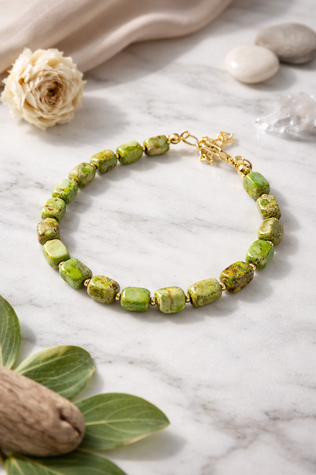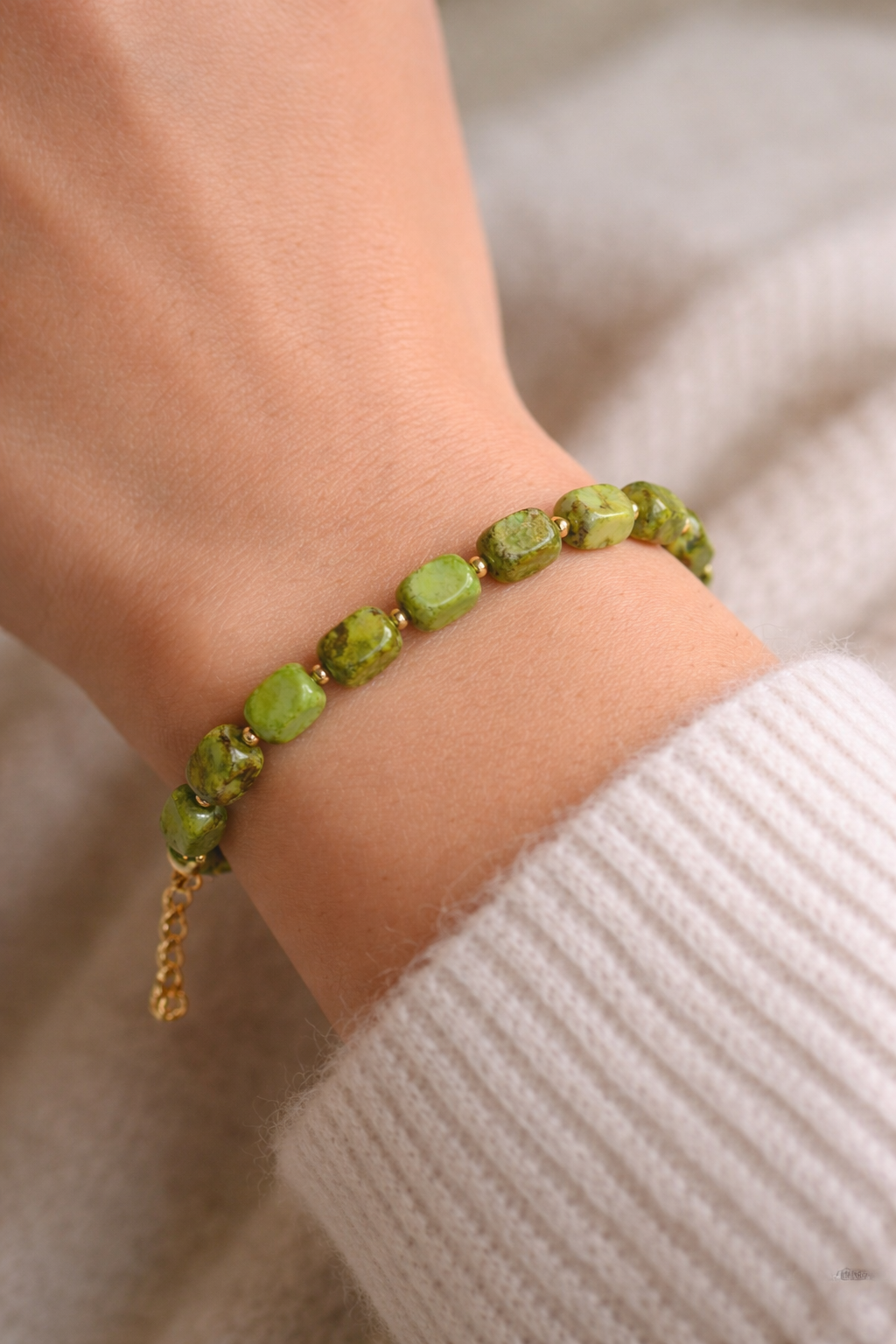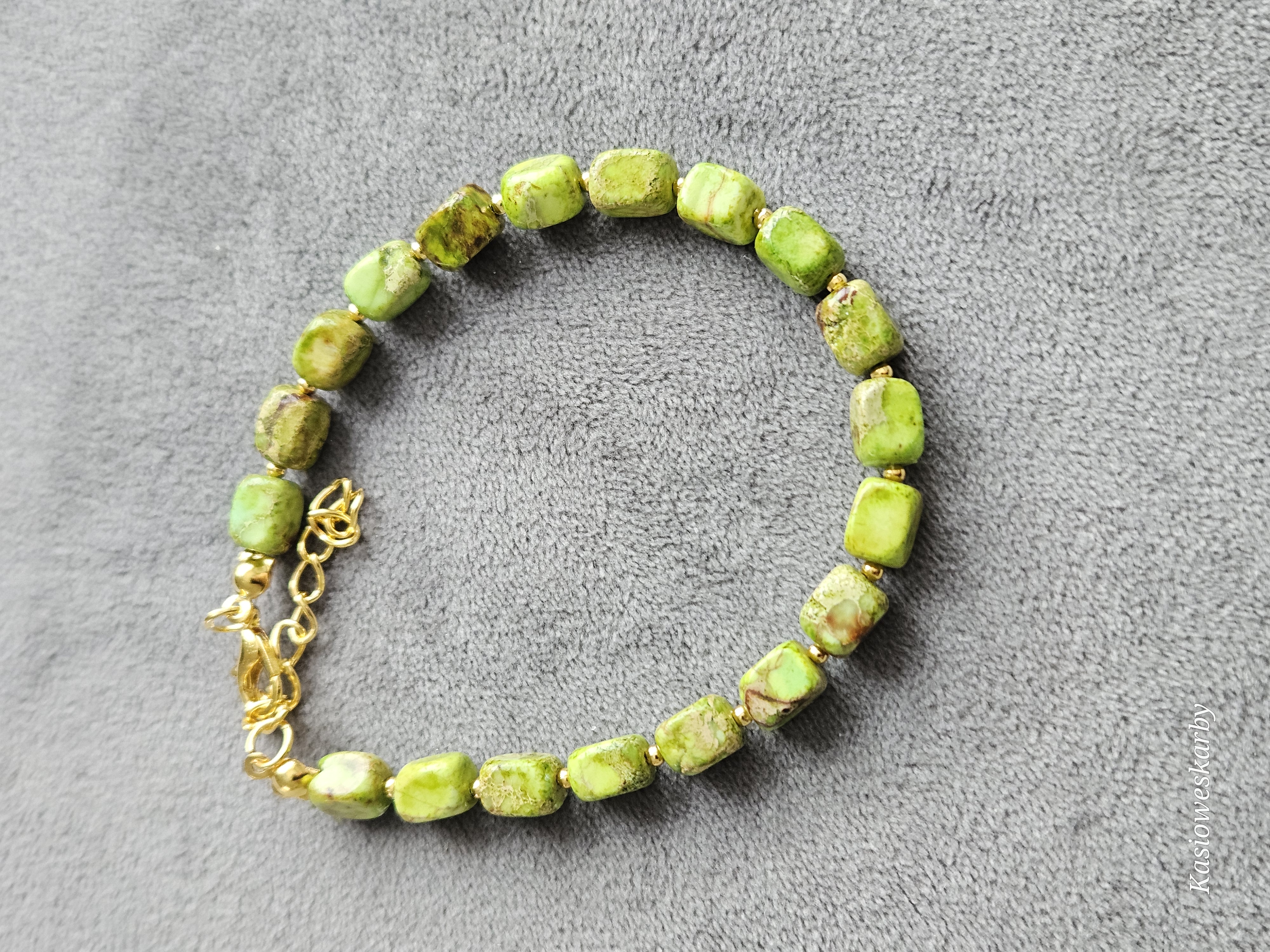 Wyjątkowa, ręcznie wykonana bransoletka z naturalnych kamieni w pięknych odcieniach zieleni. Każdy kamień posiada unikalny rysunek i strukturę, dzięki czemu każda sztuka jest niepowtarzalna. Subtelne, złote przekładki dodają elegancji i podkreślają naturalne piękno kamieni.